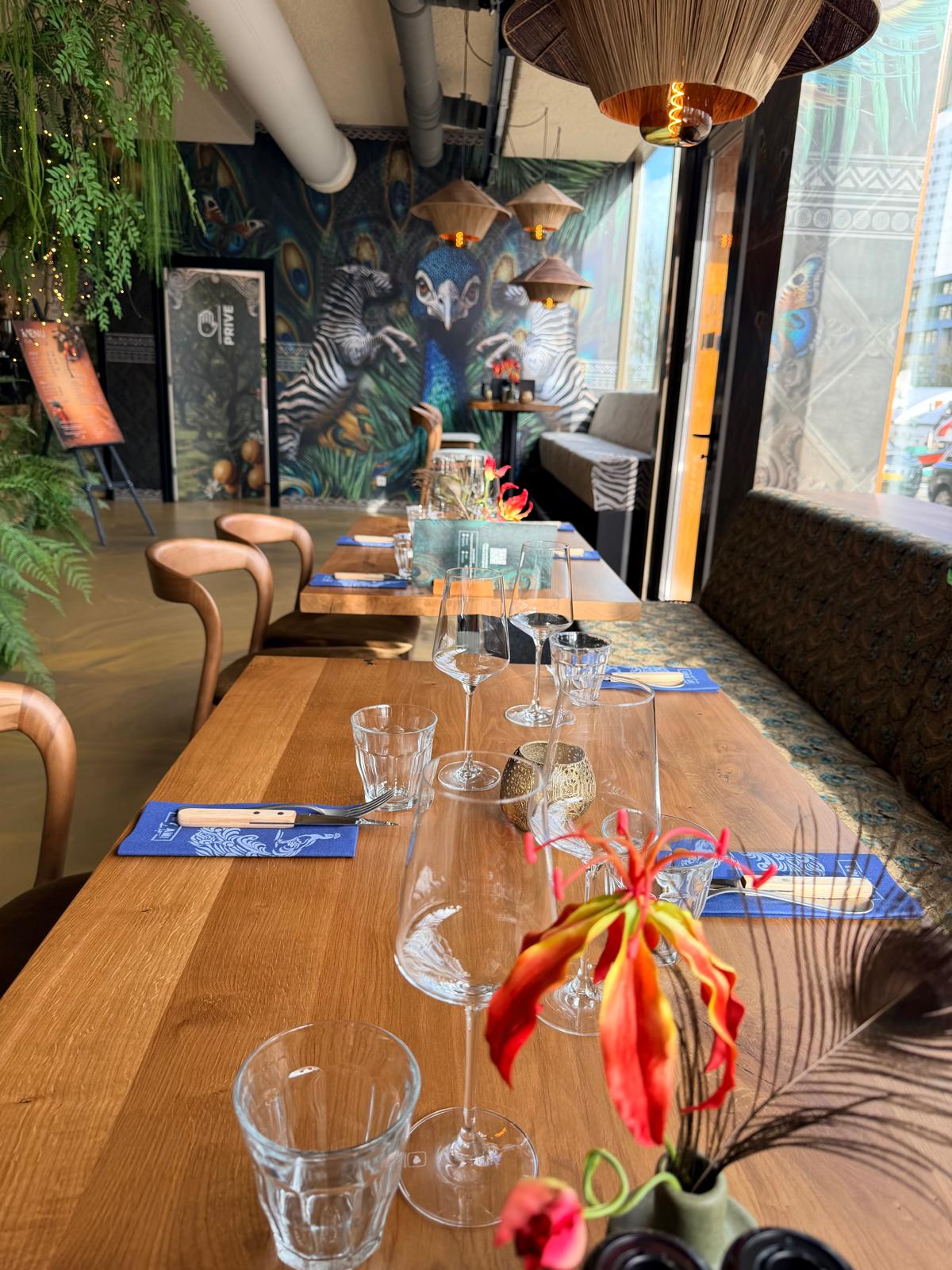 Oase vibes, zandtinten, hout en speelse pauwen & zebra accenten.